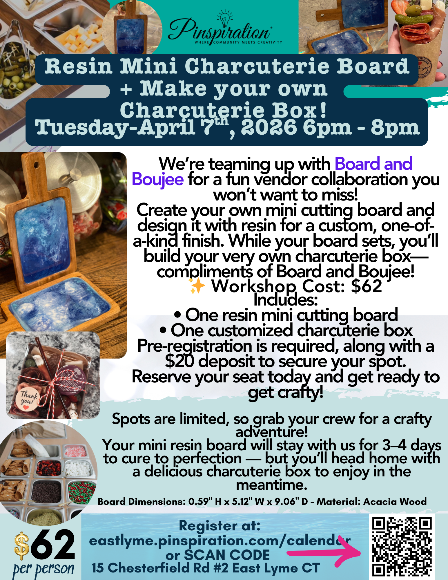 Below is our calendar of any upcoming workshops, events, pickup options, and camps! Click on any event to view details and buy a ticket. Email us at eastlyme@pinspiration.com with any questions. Thank you!